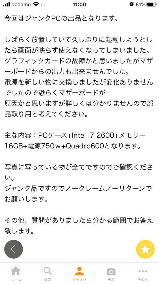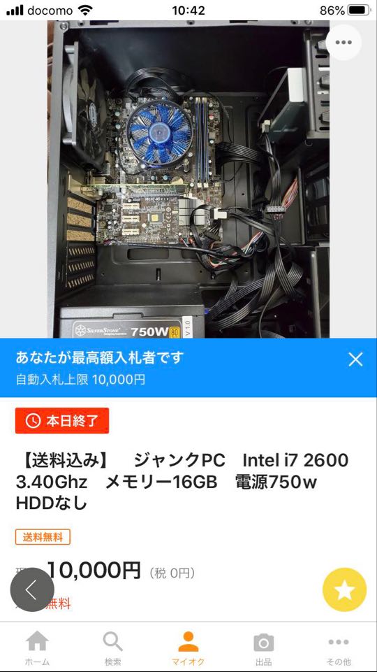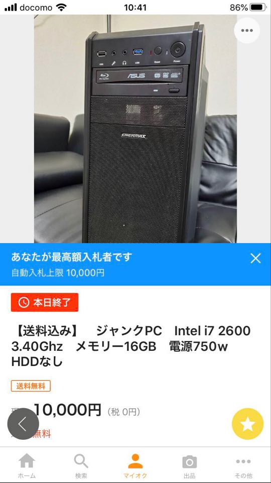 ケースを買おうと思ってヤフオクを見ていたのですが、気が付いたらジャンクPCを入札していました笑 初めてのジャンクPCということもあって家に届くまで胸が高鳴りました。