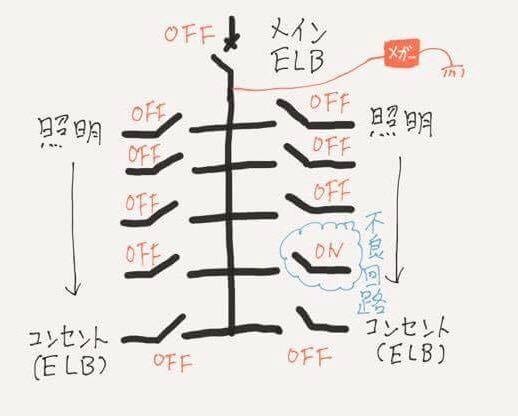 OFFにして絶縁抵抗が上昇したら、その回路は不良回路と確認できます。