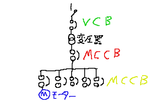 これをふまえて青のモーターの上位のMCCB(黄色)は