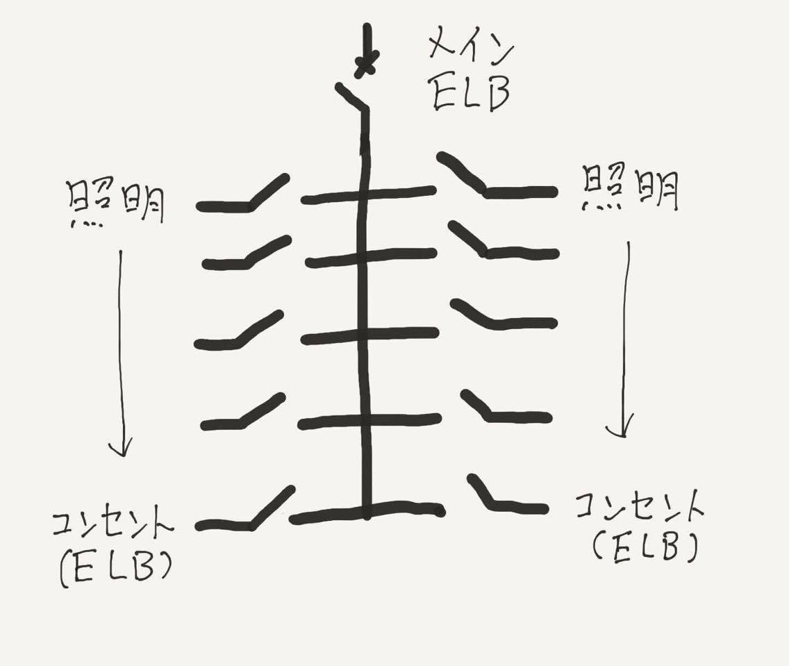 照明は個々にELBを設置している場合は少ないのでメインELBがトリップしている場合が多いと思います。