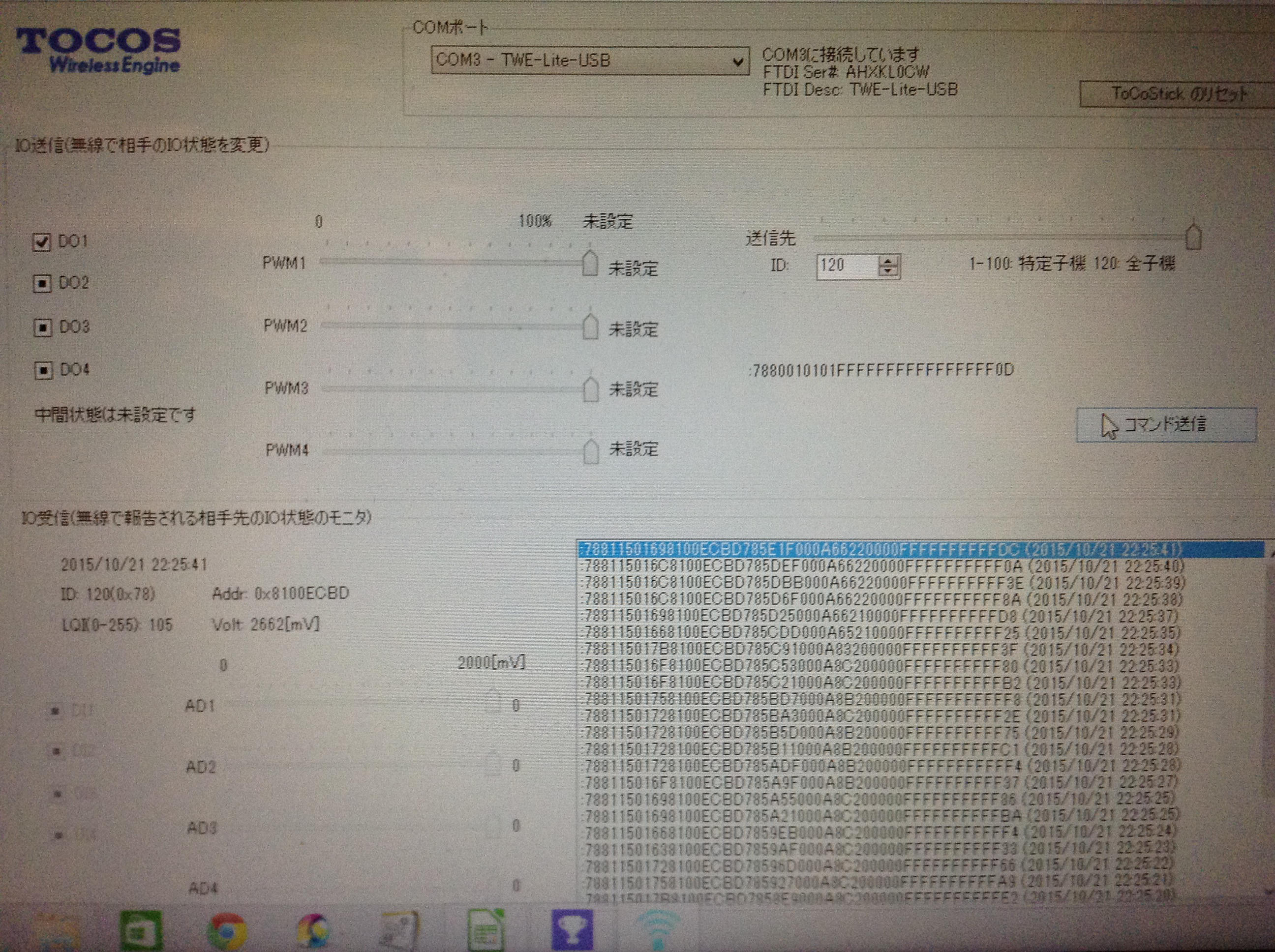 ちなみに子機のモジュールはTWE-Lite DIPっていうのを使っています、距離的には15mぐらいが限界ですが、家の中では十分ですね。