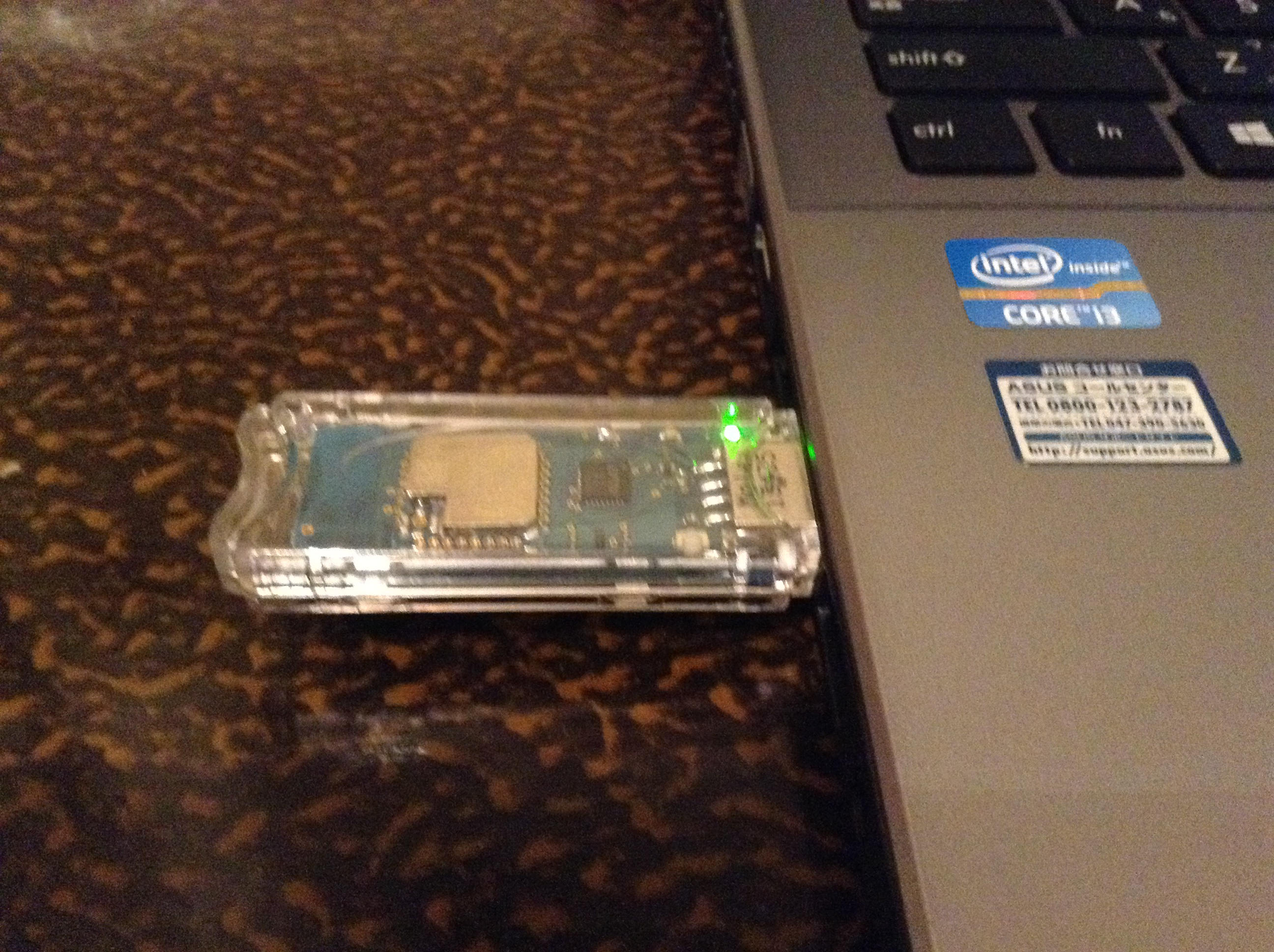 一方、送信はトコスティックというZigbee規格のモジュールをUSBハブに突っ込みます。