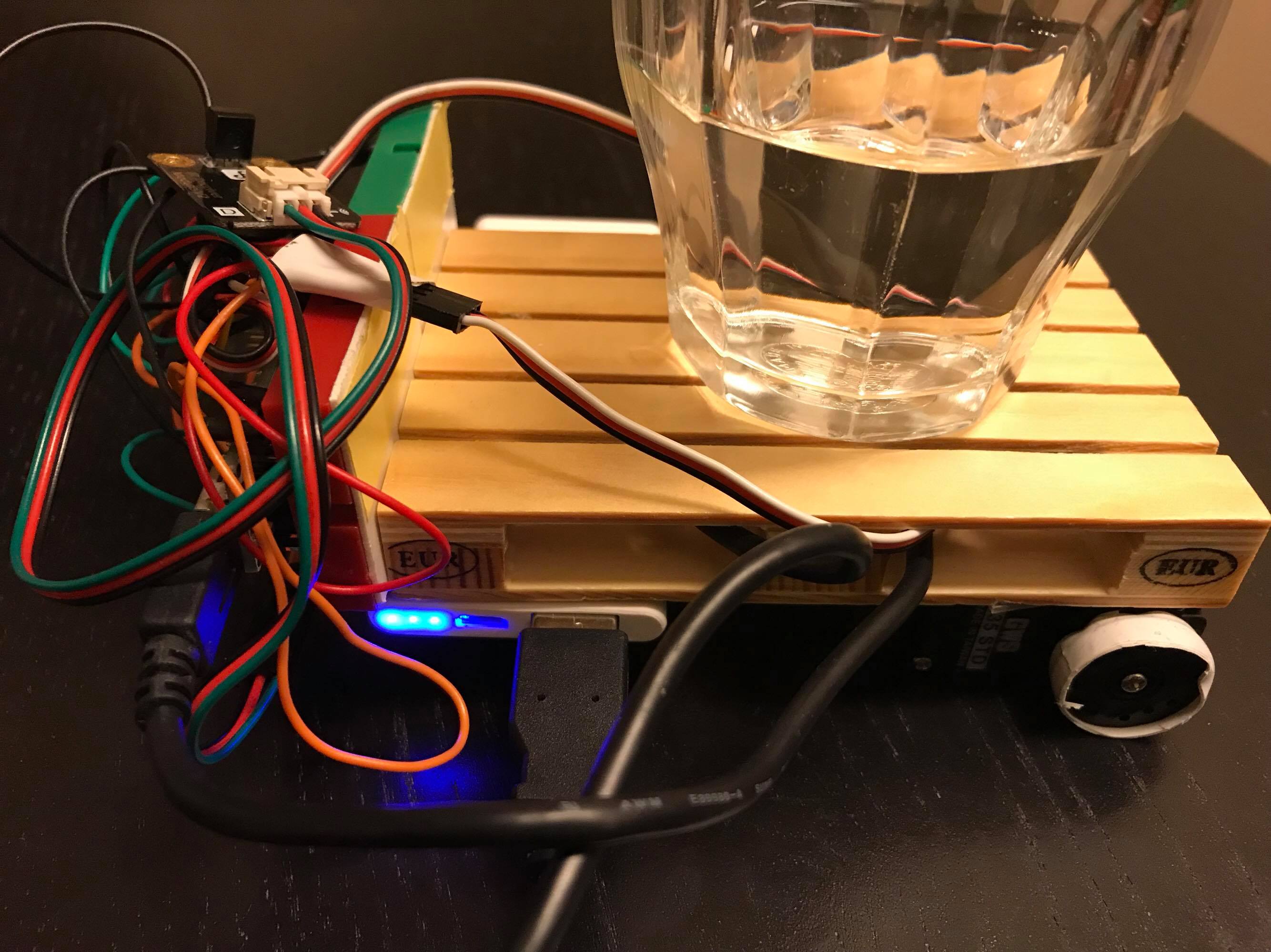 実は超音波センサーで電磁弁の下にコップが来ると赤外線の停止信号が発信されるのだが、地味すぎて動画からはほぼわからない。(必要ないかも??)
