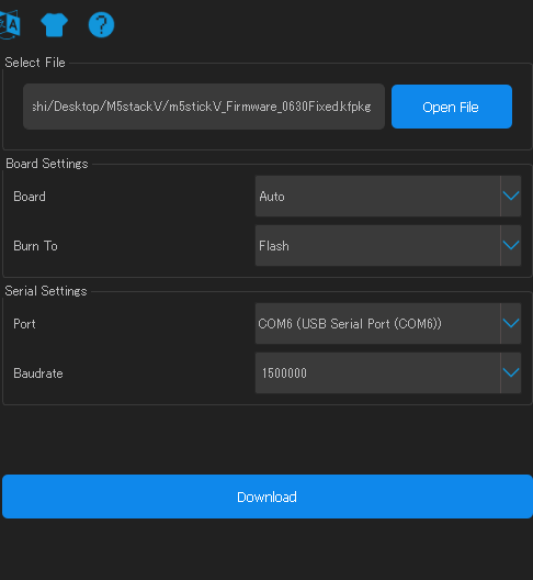 これを使って先ほどダウンロードしたm5stickV_Firmware_0630Fixed.kfpkgをM5stickVに書き込む。