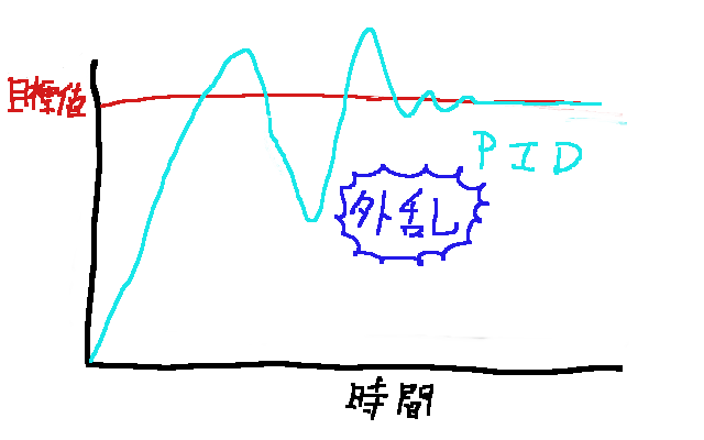 たとえば水色のラインが温度だとすると目標値を上下するように操作量(バルブが動いたりする量)が働く。しばらくすると目標値とすこしずれ(オフセット)収束していく。