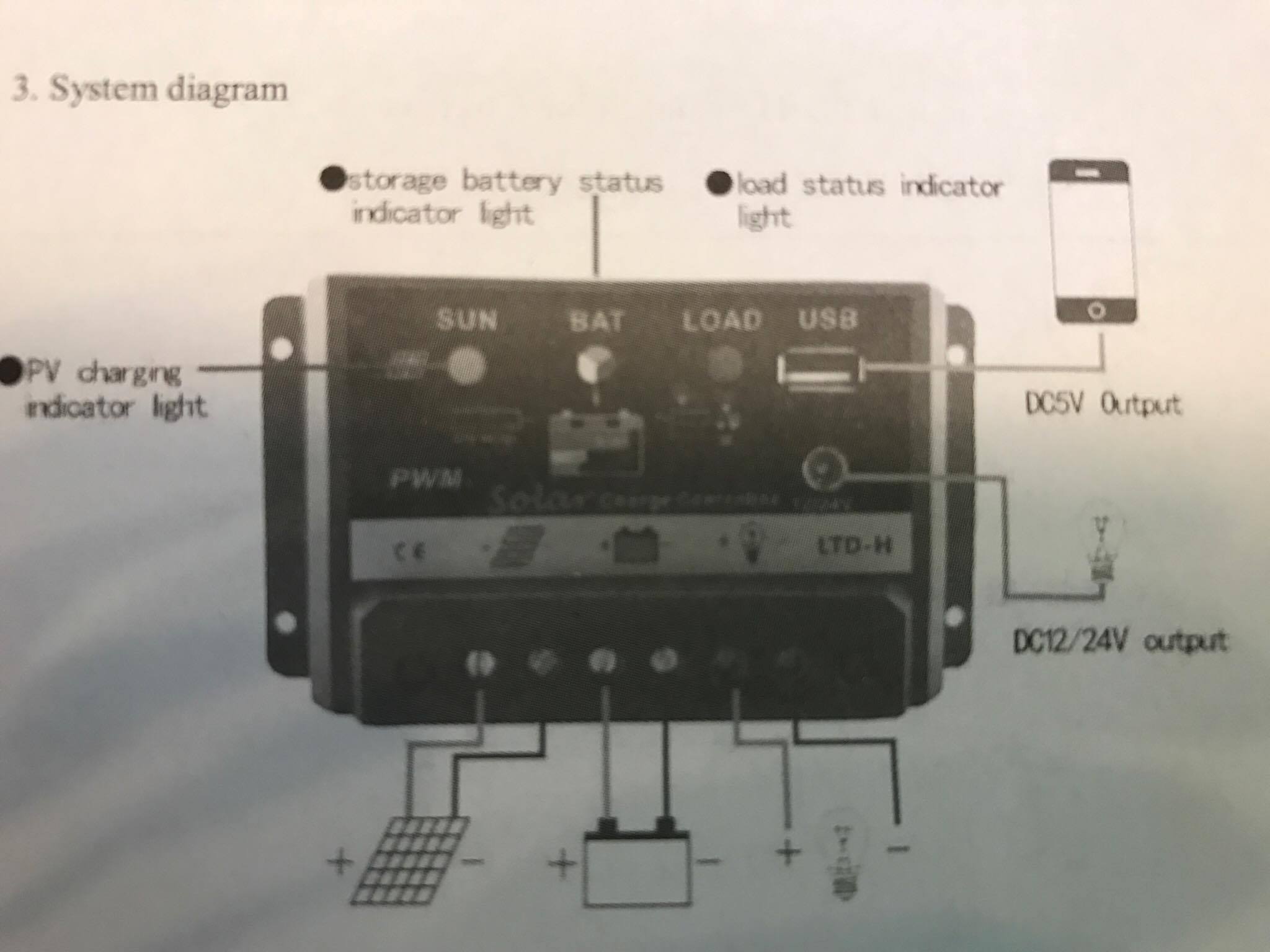これはチャージコントローラーを表しているんですが、下の接続端子に太陽光パネルとバッテリー、負荷(今回はインバーター)をプラスマイナスに注意して接続していく感じです。