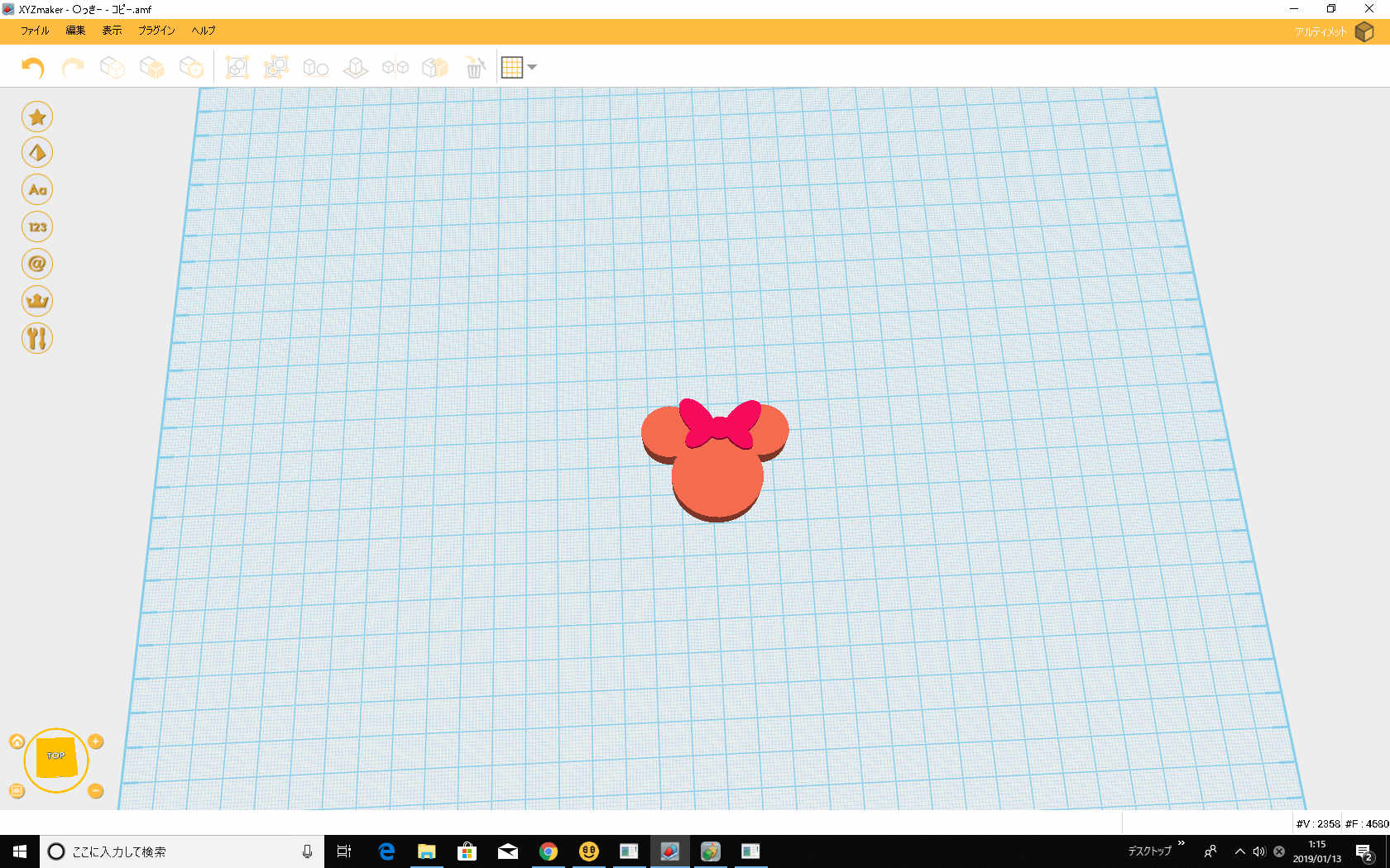 3Dプリンタはダヴィンチプロ1.0でXYZmakerでやりました。キャラ物は寸法の比に注意します。ミ〇ーちゃんも作ってみました。割とうまくできたかな。