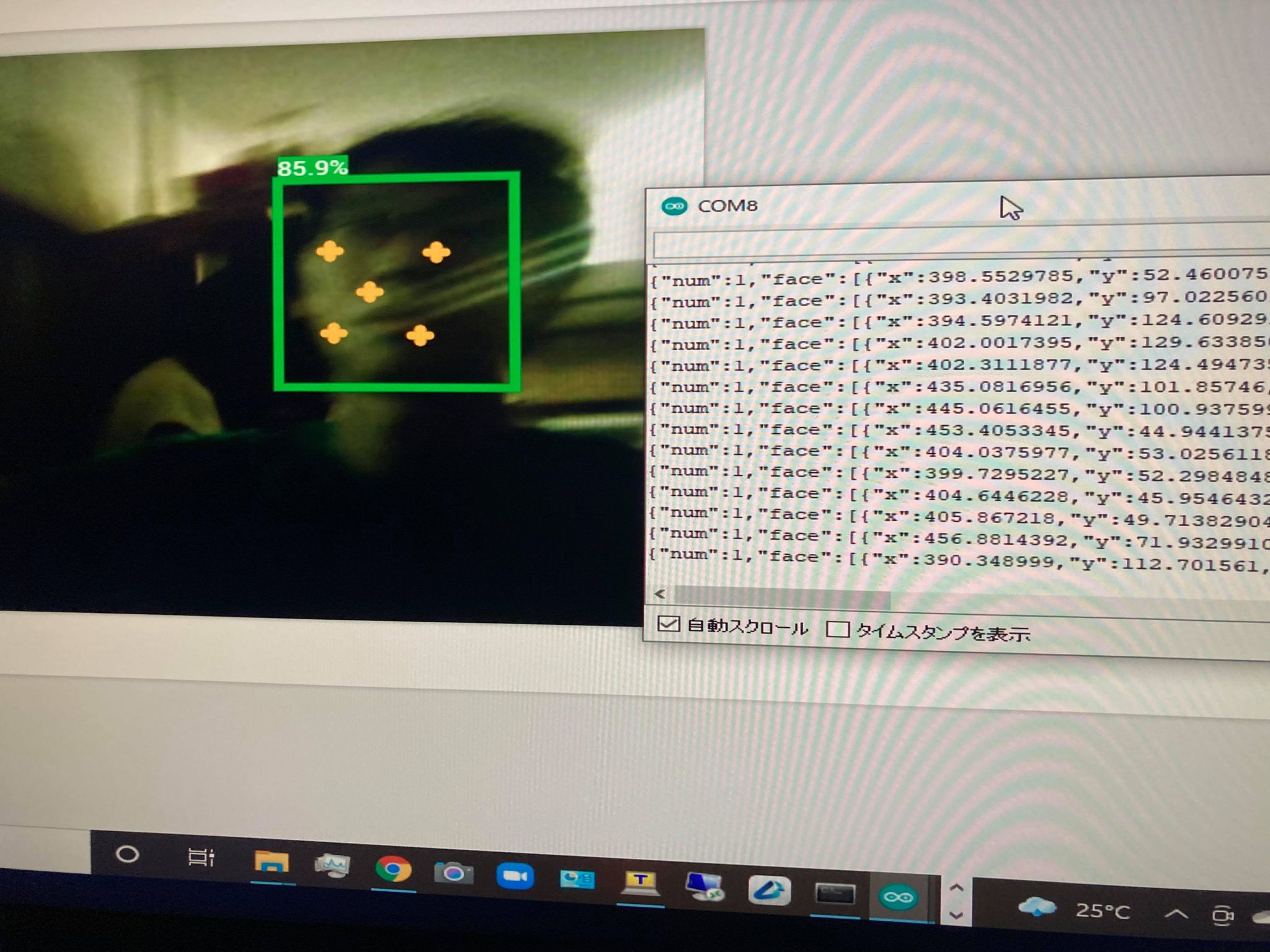 jsonが出力されシリアル通信が確認できます。(ピンを逆に挿してしまうとでません)