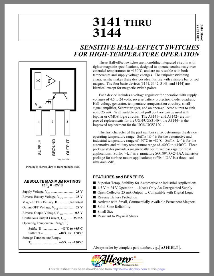 フォトトランジスタなどと使い方は同じで磁力が加わるとOUTPUTからGROUNDに電流が流れる