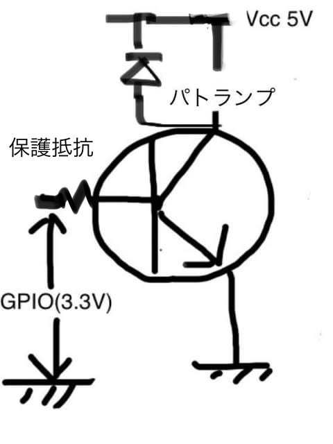 パトランプは負荷のところへ挟み込み、片方はラズパイの5V出力につなぎます。3.3VのGPIO出力はベースとしてトランジスタへ接続します。コレクタに流せる最大電流は150mAなので問題ありません。